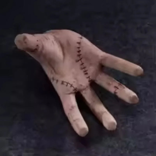 The hand features gruesome details like stitched skin and grime, creating a convincingly eerie appearance perfect for Halloween.